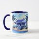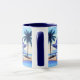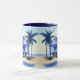 Uma caneca de café numa charmosa casa de praia com uma varanda enterrada entre duas palmeiras altas, diante de um oceano sereno sob um céu claro e brilhante.