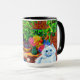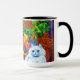 Café Mug com a pintura animal de Louis Wain Master of Cat College (1860-1939). Um gato branco pensativo com olhos azuis impressionantes senta-se pesadamente ao lado de uma variedade vibrante de flores bonitas. A majestosa faculdade de gatos venta no fundo sob um céu rosa e azul. Um presente maravilhoso para amantes de gatos e arte inglesa.