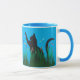 Silhueta de gato em preto com libélulas coloridas e plantas cattail em fundo azul.
