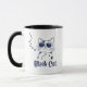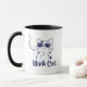 A minimalist black cat illustration printed on a ceramic mug, featuring clean line art and bright yellow eyes as the focal point. The cat sits calmly with its tail gently curved, creating a cozy and elegant look. The simple design ensures clear, high-quality printing and a modern aesthetic.