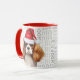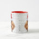 A caneca tem uma design de um lindo cão Cavalier King Charles Spaniel vestindo um chapéu de Papai Noel. O fundo da caneca é coberto por um padrão repetitivo das palavras "woof". A imagem é brilhante e alegre, e seria perfeita para um presente temático de Natal.