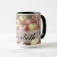 Cesto de maçãs com mesa de aquarela vintage Pintage A aquarela vintage de um cheio cesto de maçãs, com poucos pineges, numa mesa de madeira vintage, com cores vintage e de queda, sobre fundo vintage.