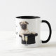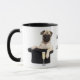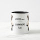Esta é uma caneca fofa que colocará um sorriso na cara dos seus colegas de trabalho! Ele apresenta um adorável cachorro colorido sentado em um chapéu preto. Na frente dele está um copo de champanhe espumante. A imagem é impressa duas vezes na caneca, com o texto entre eles que diz "COFFEE agora — CHAMPAGNE depois". O texto está em um campo personalizável, para que você possa alterá-lo se quiser.
