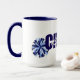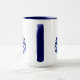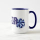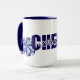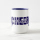 Esta caneca de café é mostrada com um impressão de átomos de cheerleader. Cores Azul Profundo e Branco Personalize esta caneca ou comprar conforme projetado. Imagem licenciada