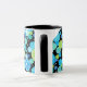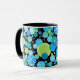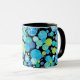 Uma Caneca de Ringer Chic com um padrão de Luas Azuis peculiar em Aqua, Turquesa, Emerald Green, Neon Green e Dazzling Blue sobre fundo preto. Parte da coleção 'Luas Azuis' de Posh & Painterly.