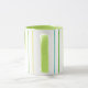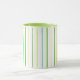 Uma caneca de café de toque com lábio e alça verdes e um padrão de listras em Turquesa, Verde Folha e Amarelo Ouro em um Fundo Branco; da coleção Posh & Painterly 'Sunshine'.