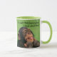 Branco e limão 11 oz. combo caneca com uma imagem, de ambos os lados, de um chimpanzé viscoso a verde e uma observação facultativa e inofensiva.