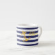 As características chiques náuticas azuis marinhos da caneca do café e as listras do branco cobertas com um ouro ancoram e personalizaram com seu nome em ambos os lados.