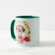 This custom mug is the perfect way to make a memorable gift for family, friends, or even yourself! It features a vibrant, high-quality print of a gorgeous gold glitter-effect wreath encircling your cherished family photo. The wreath is beautifully accented with classic holiday elements like poinsettias, holly, berries, and evergreen sprigs.