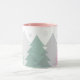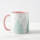 This ceramic coffee mug is shown in a refreshing image of woodlands fir tree print. Snowflakes grace the mug cascading down from the rim.