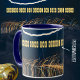 Foto de abstrato de exposição longa: luzes laranja dançantes e fundo azul-relâmpago branco. Um sotaque elegante à decoração de sua casa. Pode substituir o texto "Por mais tempo que a noite, o amanhecer irá quebrar" pela sua própria mensagem