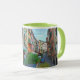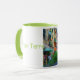 As vilas de beira-mar mediterrâneas coloridas de Cinque Terre, Italia: esta caneca é aparada com uma máscara bonito do verde para coordenar com os obturadores de madeira nas janelas do famoso embebe, enrolando ruas da região de Liguria. As construções brilhantes desta área costal áspera deixam cair dramàtica ao mar azul. Estas cinco vilas são um local do património mundial do UNESCO