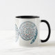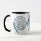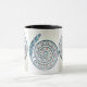 Uma pintura limpa de um padrão nativo americano. O padrão consiste em um círculo com uma dentro de pena, e o círculo é cercado por uma espiral. A espiral é cheia de espirais menores, e o padrão geral é preenchido com uma variedade de formas geométricas. O fundo é branco.