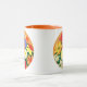 Mug em uma ilustração detalhada de margaridas e radares em tons brilhantes de laranja, amarelo e vermelho