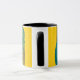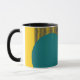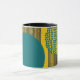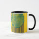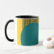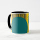 Esta caneca tem uma design de círculos moderna do século médio, com linhas saindo delas em preto e verde num campo de ouro.