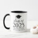 Ofereça ao formando uma manutenção personalizada da graduação com esta caneca de café da graduação moderna! O design apresenta um boné de formatura preto na parte superior da design com "Classe de 2025" exibido em letras negrito. Personalize a caneca de café preto e branco com o nome do formando e a escola. O design repete atrás. Esta caneca de café é perfeita para formandos segundos graus e universitários.