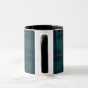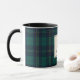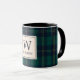 Custom-designed monogram coffee mug for the holiday season featuring classic style dark green and navy tartan plaid with personalized initial and name.