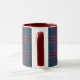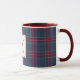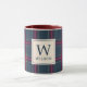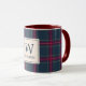 Custom-designed monogram coffee mug for the holiday season featuring classic style navy blue and red tartan plaid pattern with personalized initial and name.