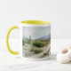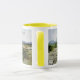Codorniz de Santan: a caneca de café do Dois-tom (o punho cerâmicos, do amarelo e a borda brancos) com codorniz de Santan projeta, da deserto da arizona opinião das montanhas de Santan, gráfico digital do corpus Omphalos do livro, poesia e coleção de arte 2012, por Mary Elizabeth Kibler, autor/artista
