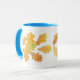 Uma caneca branca com jante azul em pó e uma pega que complementa o design de outono das folhas coloridas de carvalho.