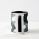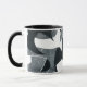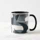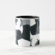 Uma caneca branca, com lábio e alça pretos e um desenho abstrato em cinza, preto e branco, de uma tela de Judy Adamson.