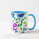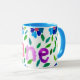 Uma caneca branca, com jante azul em pó e alça, e o nome "Jane", cercada por um aspergaminho de folhas e flores, de um design de colagem de papel pintado à mão por Judy Adamson. Cartões de saudação correspondentes também disponíveis.