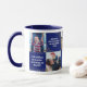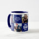 Caneca de dia de os pais personalizada com fundo azul, 5 fotos da família, brilho falsa em ouro, uma variedade de citações modernas de pais e os nomes das crianças.