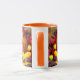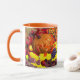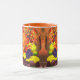 Uma caneca com minha design de uma abóbora sentada no meio de favoritos do outono, como abóbora, maçã, uva, maçã e laranja, com folhas de outono e pínus.