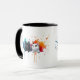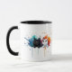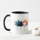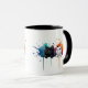 A stylish white mug with a black rim and handle, featuring three adorable cats in a colorful splash-style design. Perfect for cat lovers to enjoy their favorite hot drinks while adding a vibrant artistic touch to the kitchen or office. Durable, modern, and makes a thoughtful gift for friends and family.