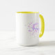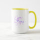 This colorful abstract neon splash coffee mug features a vibrant modern art design on a dark background.