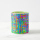 This colorful grid coffee mug features a vibrant multicolor geometric pattern wrapped around the cup with a fresh lime green handle and interior, creating a bold modern look that instantly brightens any drink break. A fun abstract design for coffee lovers who enjoy playful color and contemporary style.