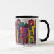 A vibrant textile artwork featuring a row of colorful patchwork houses, created with stitched fabric and hand-embroidered details. Each building is uniquely crafted with bold colors, textured materials, and visible stitching, giving the piece a warm, handcrafted charm.