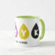Esta caneca colorida pode ser um belo presente para um designer gráfico ou para moldar sua mesa no trabalho; vem com Cotas de Tinta CMYK e "Poderes de Cores" como texto personalizável e pode ser usada para o Dia Nacional de Cores em 22 de outubro.