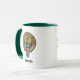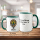 Insígnia do clã Johnston cercada por uma cinta e fivela sobre fundo de tartã. Texto personalizado em ambos os lados.