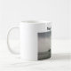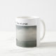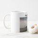 Caneca de café com imagem do barco no Lago Michigan em Chicago sob as baixas nuvens que dizem a estada o curso
