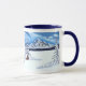 Uma caneca com uma bela cena de inverno, incluindo montanha, cabana rústica e árvores sempre verdes após uma forte nevasca. A imagem e o texto podem ser personalizados. Arte original de W.B.