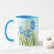 Uma caneca com imagens de belas íris azuis. O fundo, a imagem e o texto podem ser personalizados. Arte original de W.B.