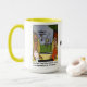 Uma caneca com um desenho engraçado sobre um esquilo tentando entrar em um alimentador de pássaros. Arte original de DBcartoons.