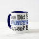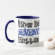 Caneca de aniversário. Setenta, setenta anos. Como aconteceu o Setenta? é a mensagem gráfica ousada nesta caneca azul e branca.