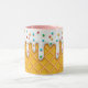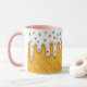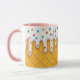 Sorvete de baunilha pingando em um cone de waffle com borrifadas multicoloridas.