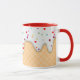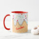 Aqui está uma caneca engraçada que faz um presente de excelente aniversário quando preenchida com o doce favorito do receptor! O padrão é um fundo de cone de waffle com gelo branco. O gelo está cheio de pontos de confete coloridos. Um lado tem um nome personalizado em vermelho.