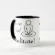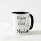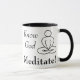 A caneca com figura na pose da meditação e a frase "conhecem o deus, Meditate!"