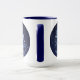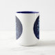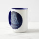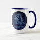 Mug que apresenta o símbolo do zodíaco de Aquário em azul-prata-suave, como medalhão-redondo, sobreposto às estrelas da constelação, contra um fundo do céu estrelado formando de azul-da-meia-noite a preto.