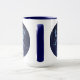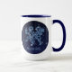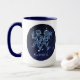 Mug que apresenta o símbolo do zodíaco para Gemini em azul-prata-suave, como medalhão-redondo, sobreposto às estrelas da constelação, contra um fundo do céu estrelado formando de azul-da-meia-noite a preto.