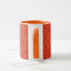 Uma caneca branca de café chic com lábio e alça laranja e um padrão delicado e úmido de esboços de Poppy em laranja num fundo vermelho picante. Parte da coleção 'Poppy Fields' de Posh & Painterly.