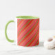 Uma caneca de café com lábio e alça verdes e um padrão estriado diagonalmente em tons de rosa, laranja e verde. As cores se coordenam com a Coleção de 'Campos de Pop & Painterly' de Judy Adamson.