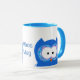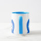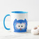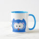 Uma caneca de cerâmica divertida com gráficos em estilo cartoon da cabeça de uma coruja feita em azul com um padrão paisley colorido ao seu redor. O texto azul, na frente da caneca, diz Whos Mug e pode ser personalizado para ler o que você quer. Boa ideia.