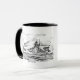 Caneca com desenho e brasão do famoso couraçado alemão Bismarck da segunda guerra mundial com o nome do navio escrito em letras Fraktur.