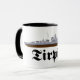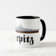 Caneca com desenho de linha do couraçado alemão Tirpitz da segunda guerra mundial, navio irmão do Bismarck, com o nome do navio escrito com letras fraktur.