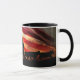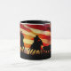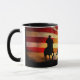 O boi do Cowboy a ropar com uma grande bandeira americana ao fundo. Uma caneca de café com cowboy patriótica, super legal do país!